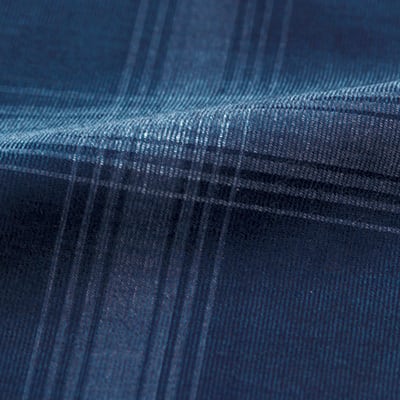 ネイビーとブルー、ホワイトの3色グラデーション状のチェック柄が上品な細畝コーデュロイ。