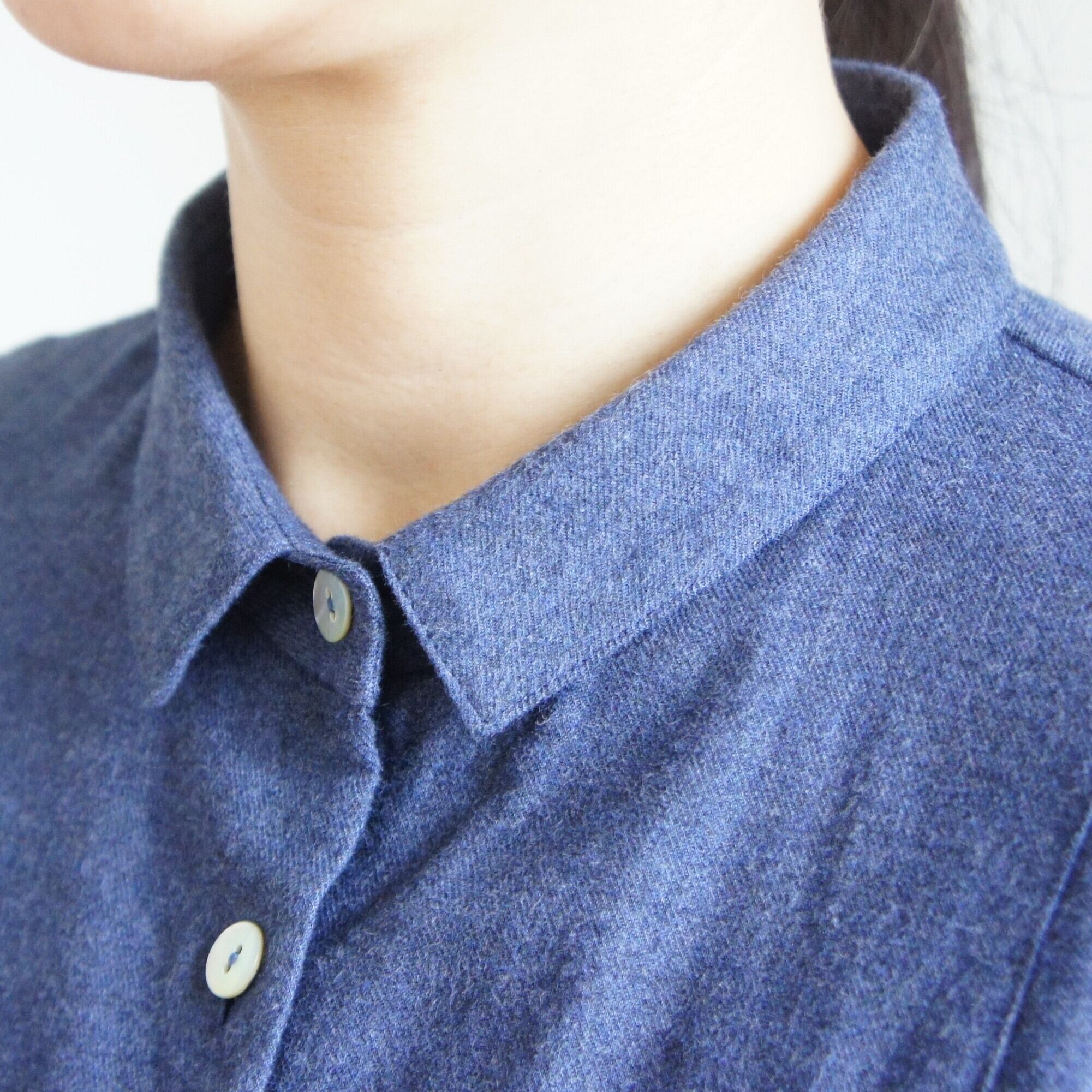 微起毛加工を施した柔らかなシャンブレーのコットンツイル生地。白と黒の糸が織りなす奥行きのあるグレーの色調も上品。切り替えを駆使したパターンで前後のペプラムによる裾のフレアーが動くたびに揺れてエレガント。