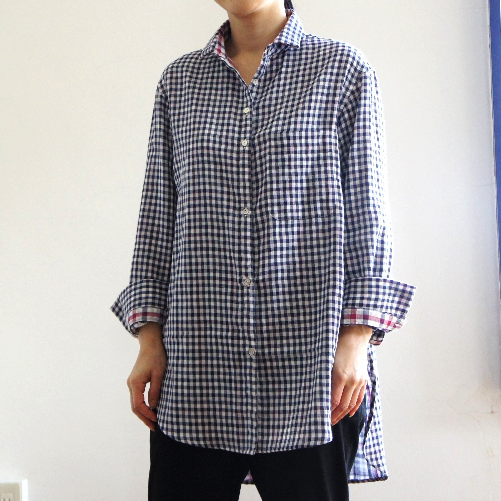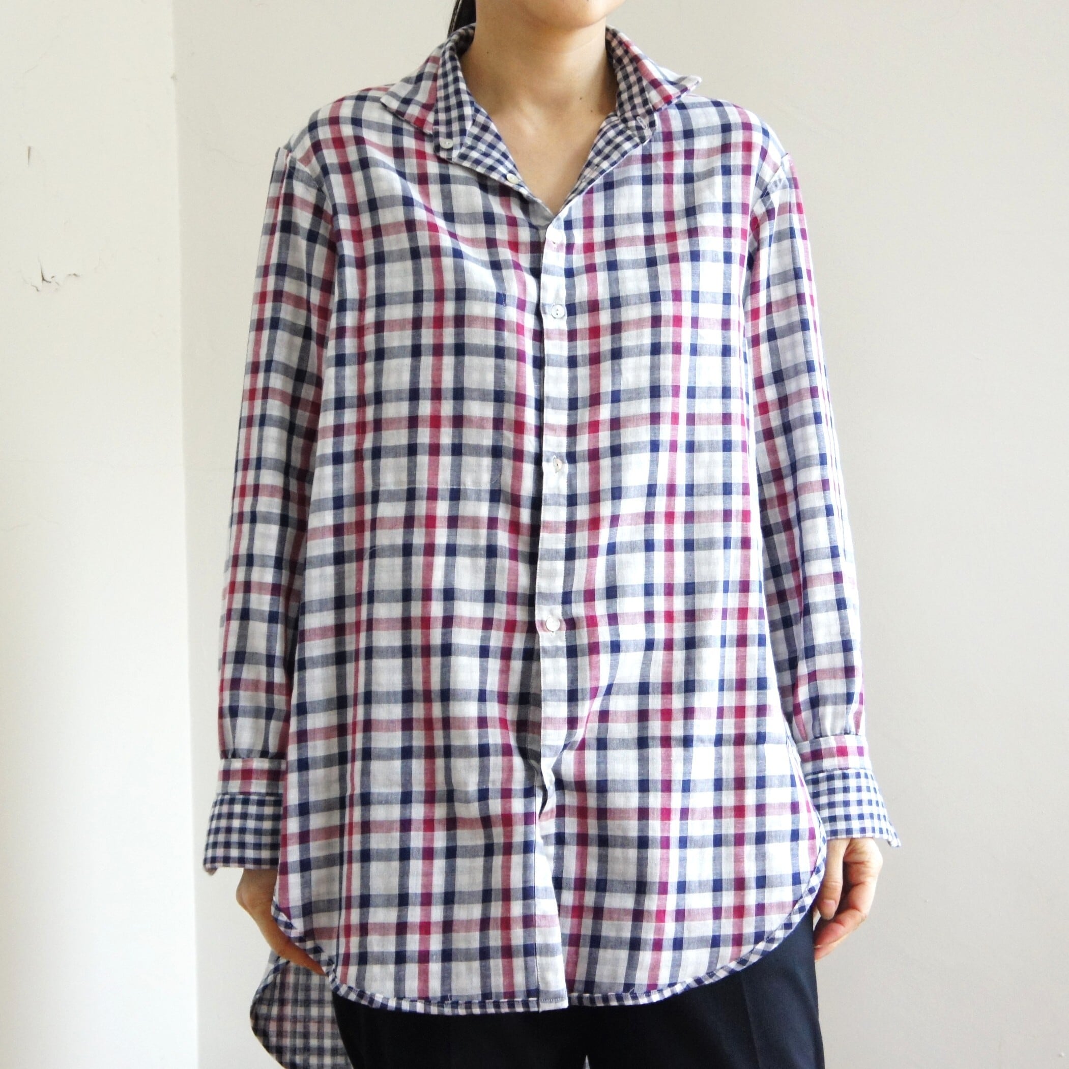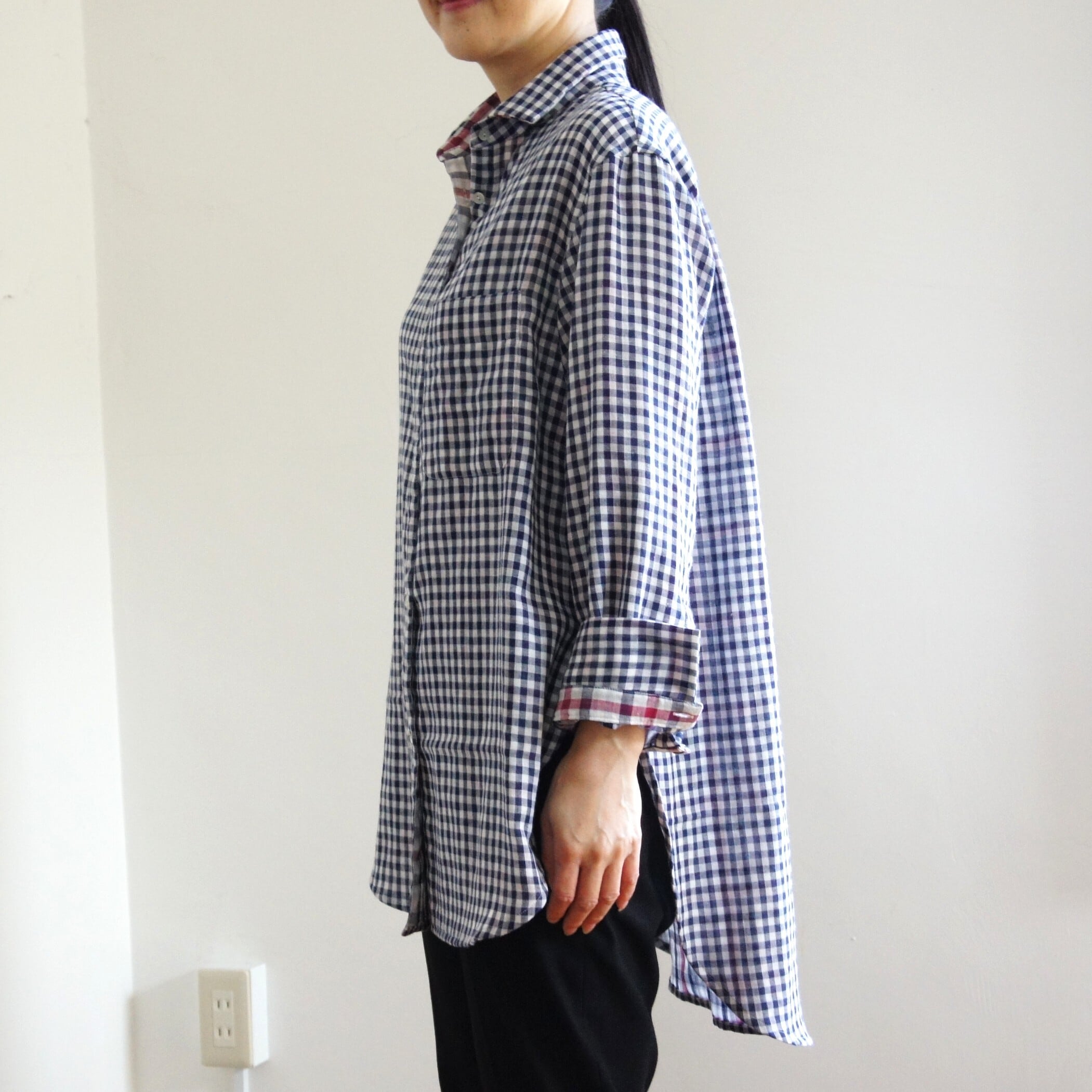 綿ボイルを裏表で張り合わせた生地で赤系とネイビー系の2色をリバーシブルで着れるようにデザインしました。軽い風合いと清涼感あふれる綿ガーゼ素材でサイドを切り込んだ曲線の裾で軽快でしなやかな印象のデザイン。
