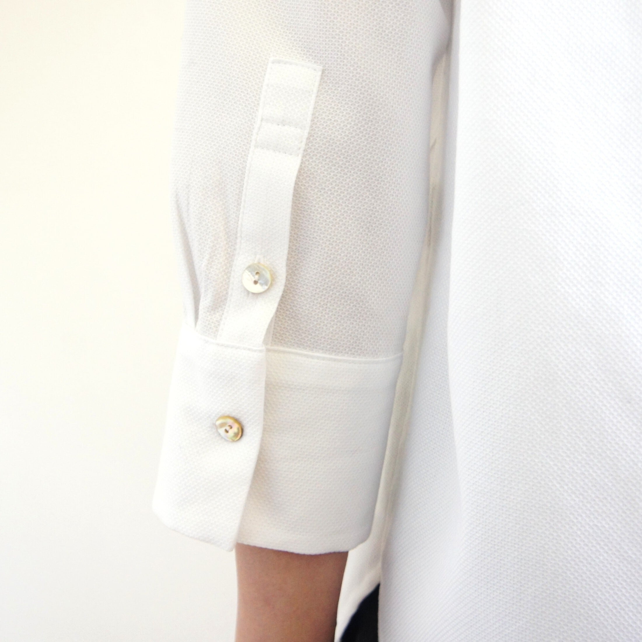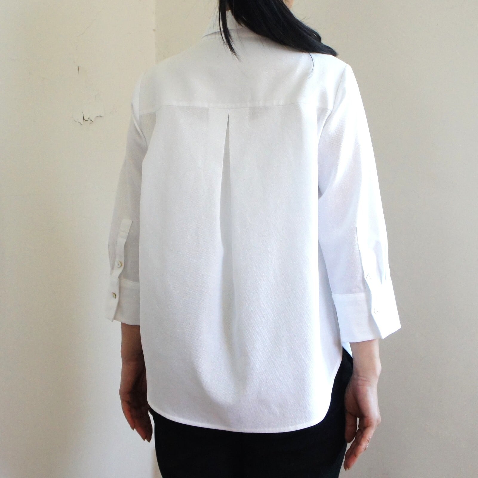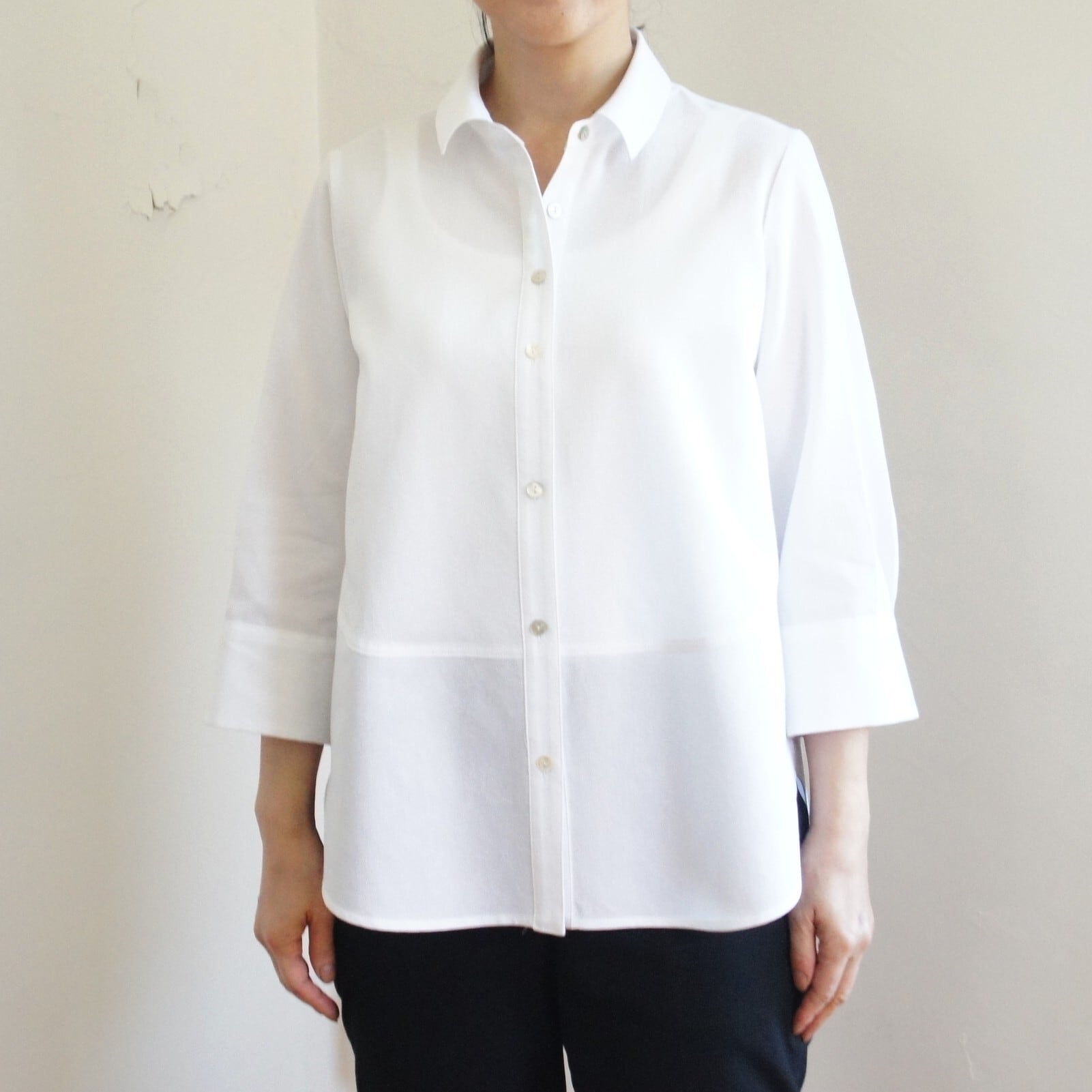 小さめの衿と七分袖でより軽さと甘さをミックスさせたシャツ。