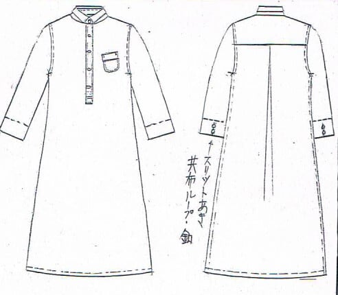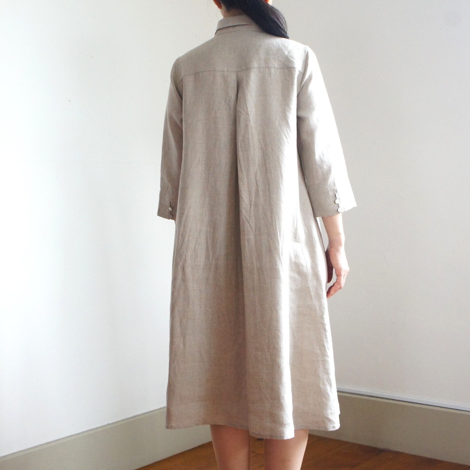 後のタックからの分量とゆるやかなAラインのシルエットで小さめの衿とポケットは定番シャツのパターンからのアレンジです。シンプルでありながらどこか可愛らしさがあるシャツワンピース。