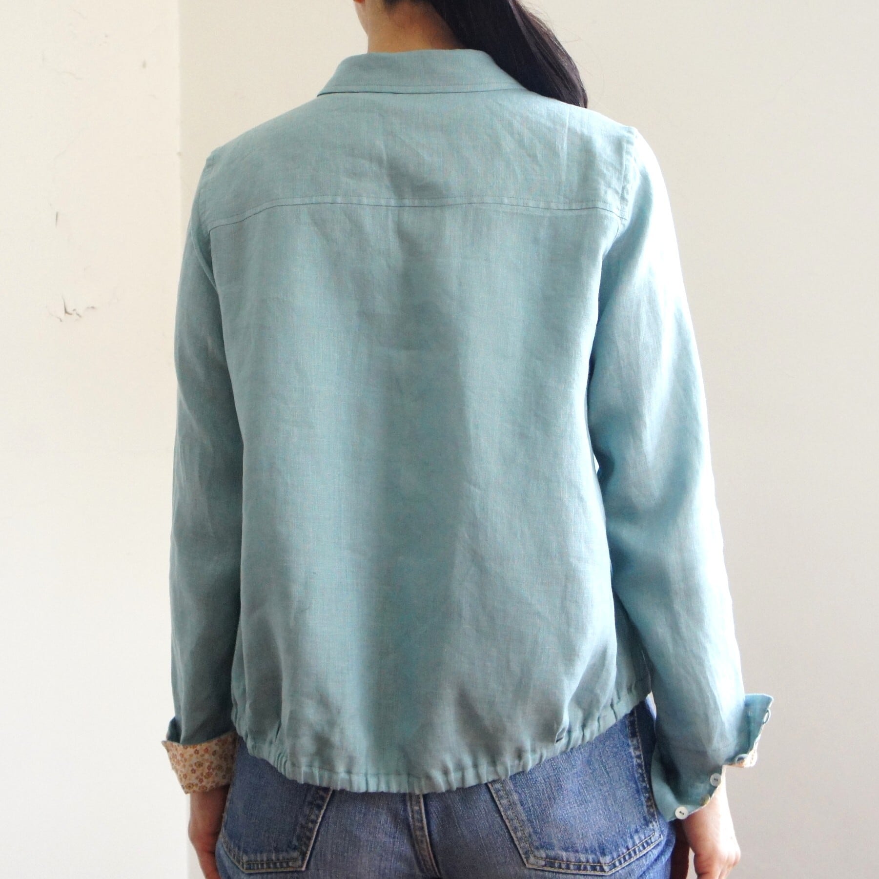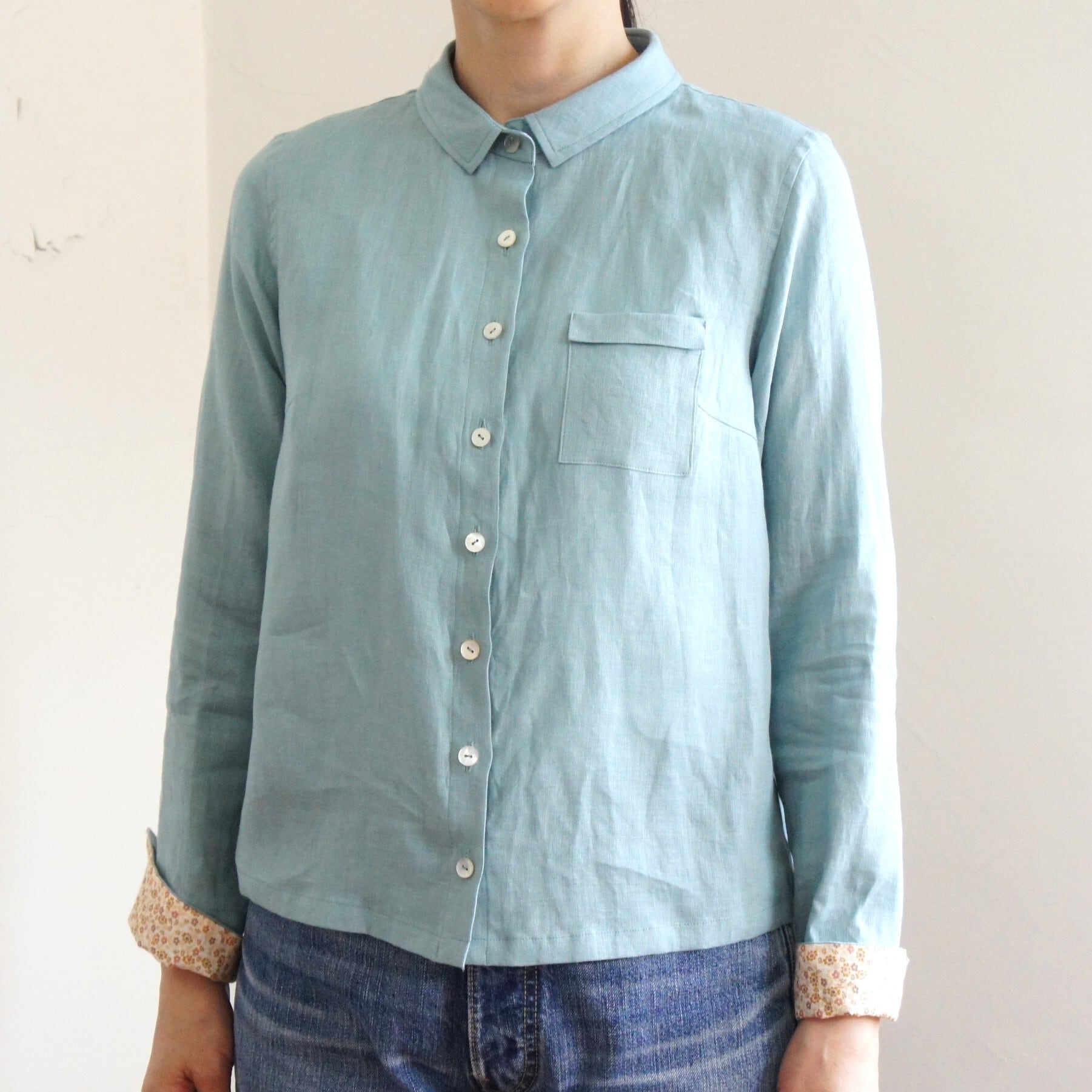 生地洗いで軽い風合いのリネン素材。おさえめのサックスブルーは麻ならでは色合い。