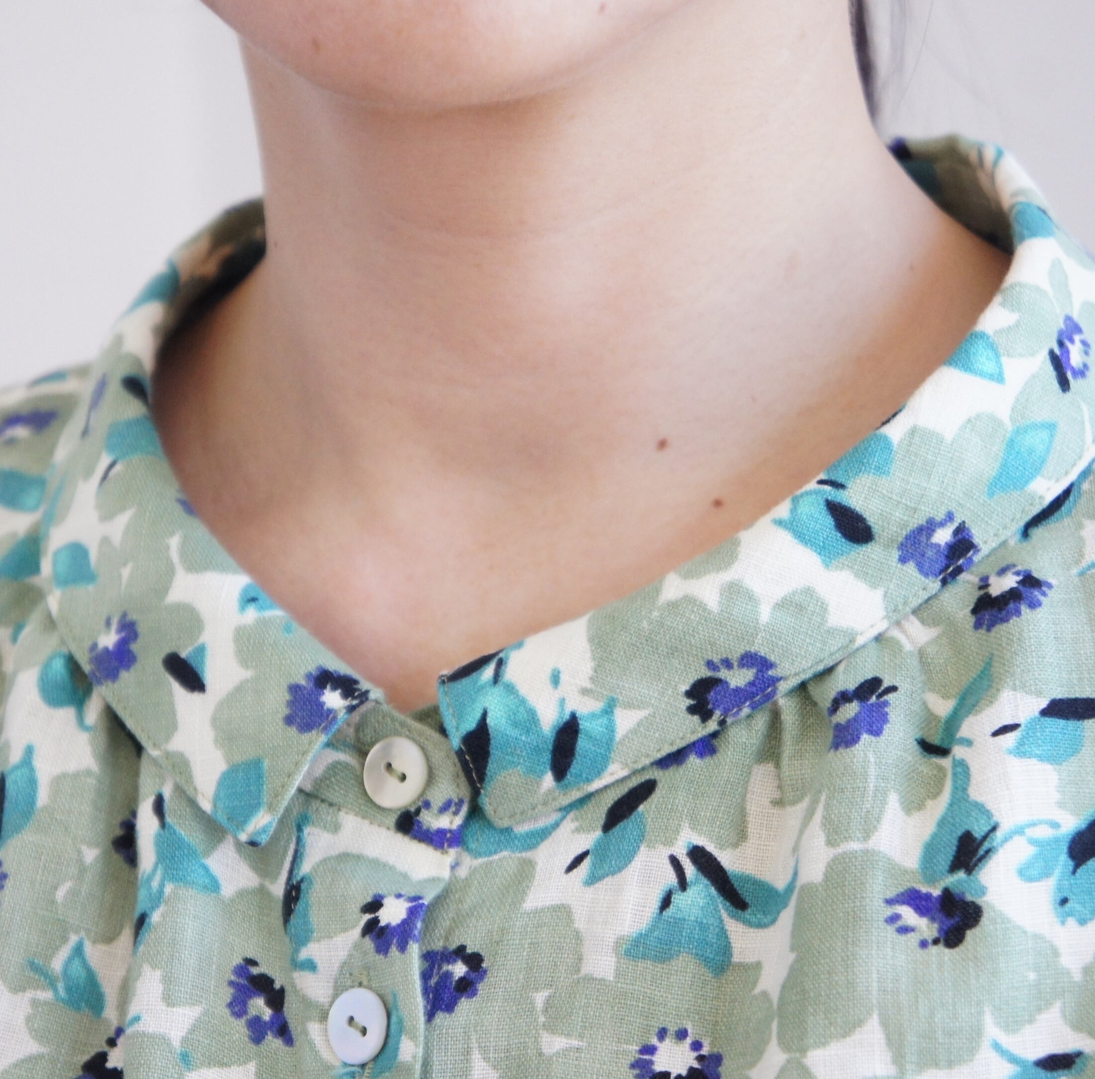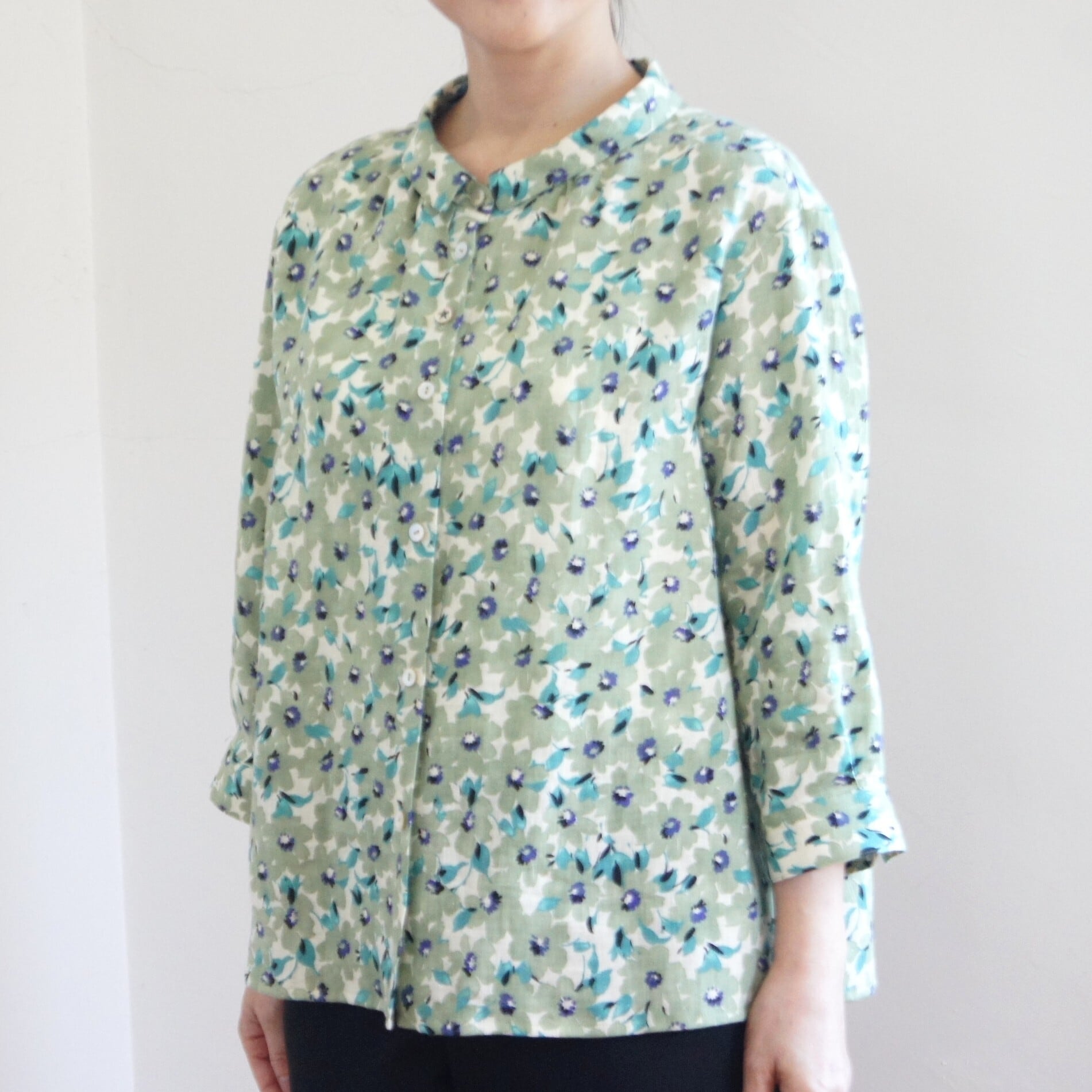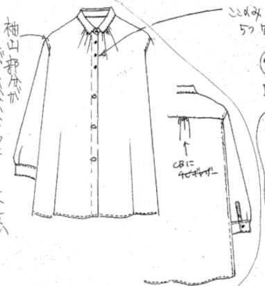 小さな衿元からのギャザーとゆったりとした身幅によるフレアーシルエットのブラウスは、フェミニンな中にもシャツ屋ならではのつくり。身頃第2釦の変わり釦もアクセント